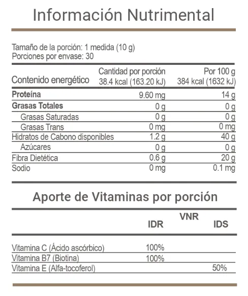 Aporte de Vitaminas: Vitamina C: 100%, Vitamina B7: 100%, Vitamina E: 50% del VNR (Valor Nutricional Recomendado).