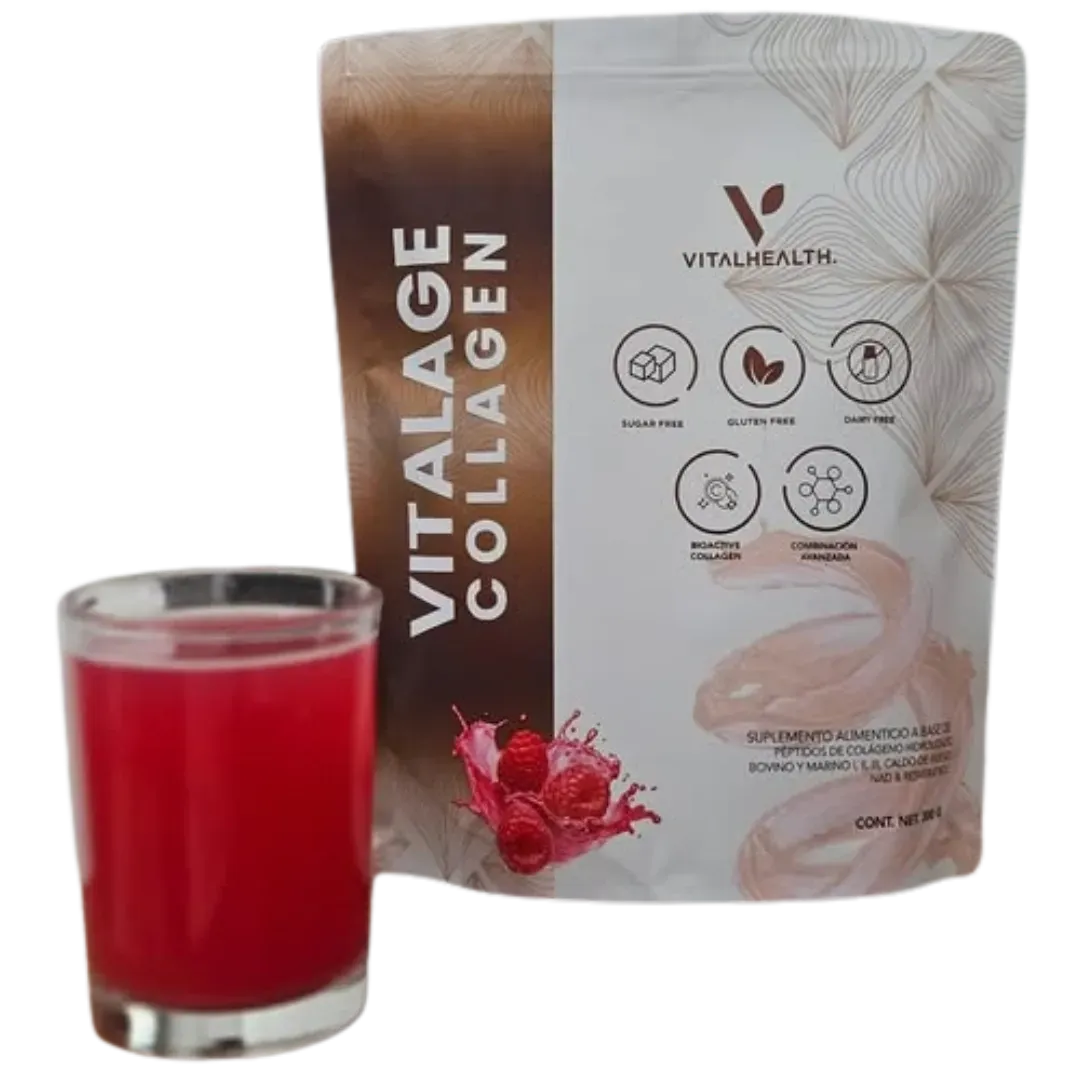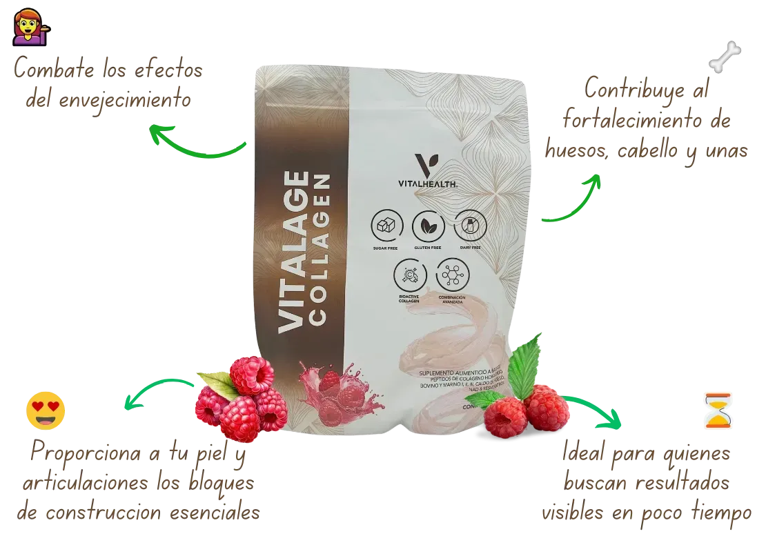 Vitalage Collagen es un suplemento alimenticio y no pretende diagnosticar, tratar, curar o prevenir ninguna enfermedad. Los resultados pueden variar según cada individuo y no están garantizados. Antes de consumir este producto, consulte a su médico o profesional de la salud, especialmente si está embarazada, en período de lactancia, bajo medicación o tiene alguna condición médica preexistente. Este producto no sustituye una dieta equilibrada ni un estilo de vida saludable. La información proporcionada en esta página no constituye asesoramiento médico. El uso inadecuado del producto es responsabilidad exclusiva del consumidor. Mantener fuera del alcance de los niños.